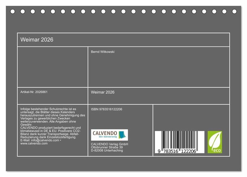 QUALITÄT - Hochwertiger Fotokalender mit 12 wunderschönen Motiven auf lichtbeständigem Bilderdruckpapier, robuste Spiralbindung.NACHHALTIG - deutliche Abfallreduzierung durch bedarfsgerechte Einzelstückfertigung, umweltfreundliches FSC-zertifiziertes Papier, Produktion in Deutschland, klimabewusste Logistik.PERFEKTES GESCHENK - Kalender für Freunde und Familie, für Kinder und Erwachsene, jung und alt, zu Weihnachten, Geburtstag oder zwischendurch.VIELFALT - Bildkalender in verschiedenen Formaten, z.B. DIN A5, DIN A4, DIN A3 sowie DIN A2. Ob Naturmotiv, Gemälde oder Fotos, ideal für ein persönliches Wohlfühlambiente.Weimar ist immer eine Reise wert. von Autor(in): Mico10