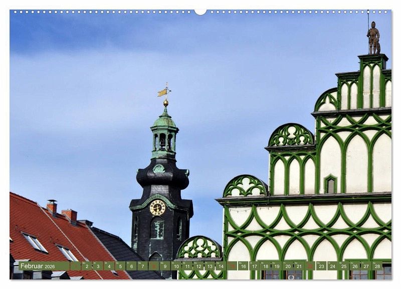 Februar: Grün-weißer Giebel des Stadthauses von Weimar mit Turm des Stadtschlosses im Hintergrund