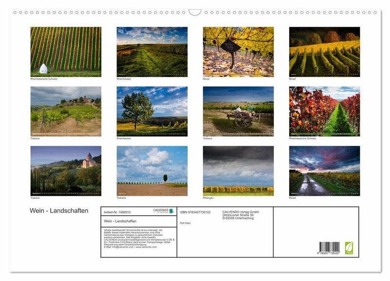 QUALITÄT - Hochwertiger Fotokalender mit 12 wunderschönen Motiven auf lichtbeständigem Bilderdruckpapier, robuste Spiralbindung mit Aufhängebügel.NACHHALTIG - deutliche Abfallreduzierung durch bedarfsgerechte Einzelstückfertigung, umweltfreundliches FSC-zertifiziertes Papier, Produktion in Deutschland, klimabewusste Logistik.PERFEKTES GESCHENK - Kalender für Freunde und Familie, für Kinder und Erwachsene, jung und alt, zu Weihnachten, Geburtstag oder zwischendurch.VIELFALT - Bildkalender in verschiedenen Formaten, z.B. DIN A5, DIN A4, DIN A3 sowie DIN A2. Ob Naturmotiv, Gemälde oder Fotos, ideal für ein persönliches Wohlfühlambiente.Wein - Landschaften wie ein Gemälde von Autor(in): Rolf Dietz