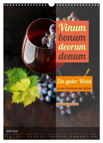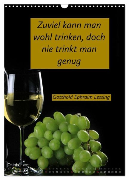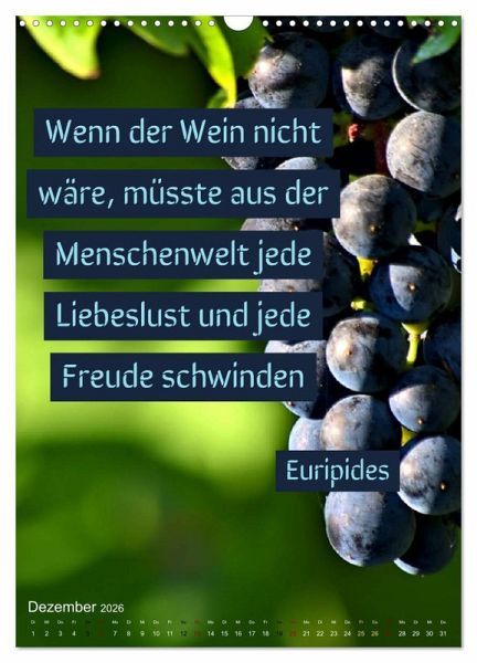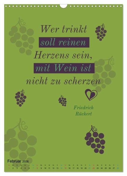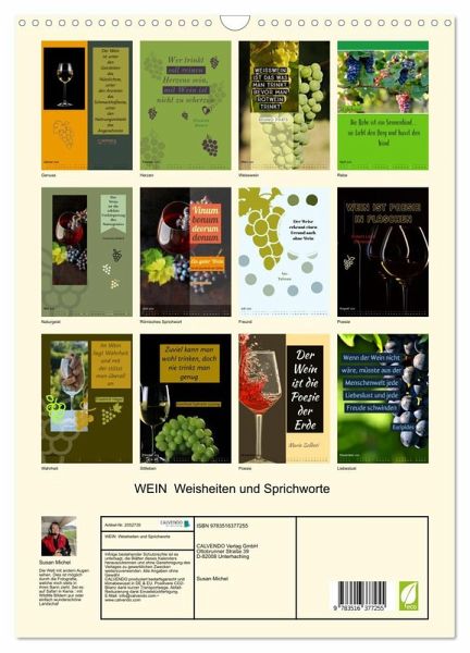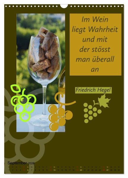Im Wein steckt so manche Wahr- und Weisheit. Dieser Kalender ist nicht nur für Weintrinker, sondern auch für Liebhaber von Weisheiten und Wein. Lassen Sie sich verwöhnen mit den Weisheiten, Sprichworte..halten Sie inne. Geniessen Sie auf eine neue Art den Wein.