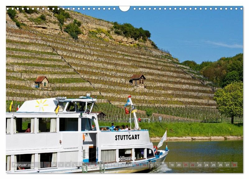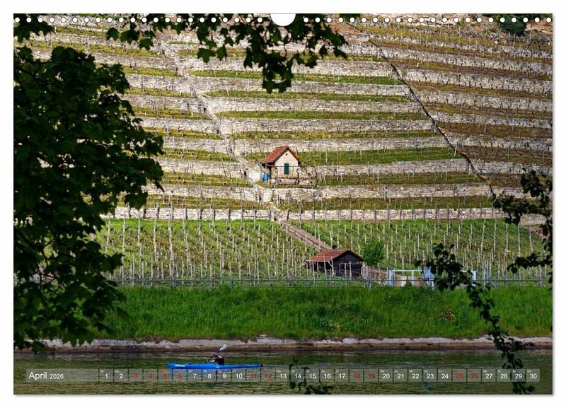 April: Weinberghäuschen - Idylle mit Kanufahrer am Neckar