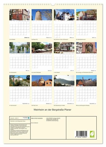 PREMIUM-LINIE - Brillanter Fotokalender mit 12 wunderschönen Motiven, Kunstdruck in Hochglanz in Museumsqualität.QUALITÄT - edle Materialien, stabile Rückwand mit 2 innovativen Einstecktaschen für eine optimale Präsentation an der Wand.NACHHALTIG - deutliche Abfallreduzierung durch bedarfsgerechte Einzelstückfertigung, umweltfreundliches FSC-zertifiziertes Papier, Produktion in Deutschland, klimabewusste Logistik.PERFEKTES GESCHENK - Kalender für Freunde und Familie, für Kinder und Erwachsene, jung und alt, zu Weihnachten, Geburtstag oder zwischendurch.Weinheim ist eine große Kreisstadt an der Bergstraße, zwischen Darmstadt und Heidelberg gelegen. von Autor(in): Ilona Andersen