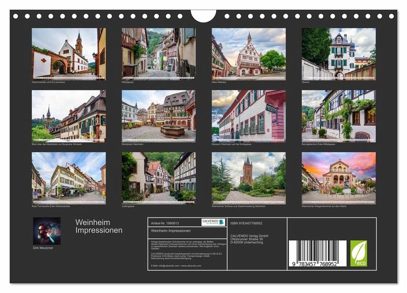QUALITÄT - Hochwertiger Fotokalender mit 12 wunderschönen Motiven auf lichtbeständigem Bilderdruckpapier, robuste Spiralbindung mit Aufhängebügel.NACHHALTIG - deutliche Abfallreduzierung durch bedarfsgerechte Einzelstückfertigung, umweltfreundliches FSC-zertifiziertes Papier, Produktion in Deutschland, klimabewusste Logistik.PERFEKTES GESCHENK - Kalender für Freunde und Familie, für Kinder und Erwachsene, jung und alt, zu Weihnachten, Geburtstag oder zwischendurch.VIELFALT - Bildkalender in verschiedenen Formaten, z.B. DIN A5, DIN A4, DIN A3 sowie DIN A2. Ob Naturmotiv, Gemälde oder Fotos, ideal für ein persönliches Wohlfühlambiente.Traumhafte Bilder der wunderschönen Stadt Weinheim von Autor(in): Dirk Meutzner