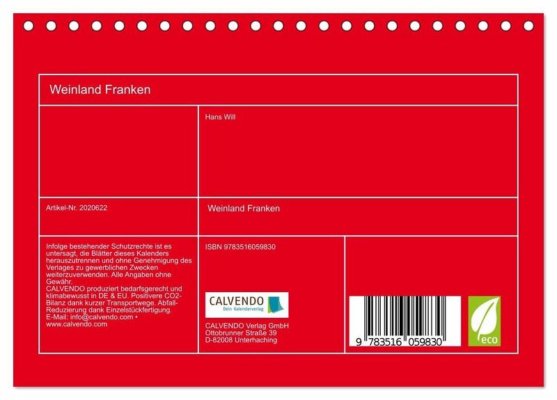 QUALITÄT - Hochwertiger Fotokalender mit 12 wunderschönen Motiven auf lichtbeständigem Bilderdruckpapier, robuste Spiralbindung.NACHHALTIG - deutliche Abfallreduzierung durch bedarfsgerechte Einzelstückfertigung,umweltfreundliches FSC-zertifiziertes Papier, Produktion in Deutschland, klimabewusste Logistik.PERFEKTES GESCHENK - Kalender für Freunde und Familie, für Kinder und Erwachsene, jung und alt, zu Weihnachten, Geburtstag oder zwischendurch.VIELFALT - Bildkalender in verschiedenen Formaten, z.B. DIN A5, DIN A4, DIN A3 sowie DIN A2. Ob Naturmotiv, Gemälde oder Fotos, ideal für ein persönliches Wohlfühlambiente.Das Fränkische Weinland liegt am Maindreieck - umrahmt vom Spessart, der Rhön, dem Steigerwald und dem lieblichen Taubertal. von Autor(in): Haenson