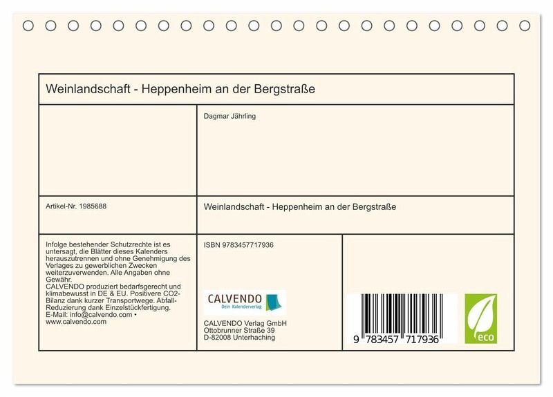 QUALITÄT - Hochwertiger Fotokalender mit 12 wunderschönen Motiven auf lichtbeständigem Bilderdruckpapier, robuste Spiralbindung.NACHHALTIG - deutliche Abfallreduzierung durch bedarfsgerechte Einzelstückfertigung, umweltfreundliches FSC-zertifiziertes Papier, Produktion in Deutschland, klimabewusste Logistik.PERFEKTES GESCHENK - Kalender für Freunde und Familie, für Kinder und Erwachsene, jung und alt, zu Weihnachten, Geburtstag oder zwischendurch.VIELFALT - Bildkalender in verschiedenen Formaten, z.B. DIN A5, DIN A4, DIN A3 sowie DIN A2. Ob Naturmotiv, Gemälde oder Fotos, ideal für ein persönliches Wohlfühlambiente.Die Kreisstadt Heppenheim ist eine beliebte Weinstadt von Autor(in): Dagmar Jährling