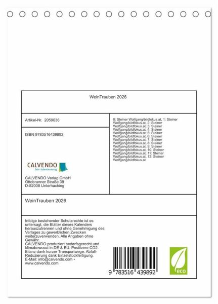 QUALITÄT - Hochwertiger Fotokalender mit 12 wunderschönen Motiven auf lichtbeständigem Bilderdruckpapier, robuste Spiralbindung.NACHHALTIG - deutliche Abfallreduzierung durch bedarfsgerechte Einzelstückfertigung, umweltfreundliches FSC-zertifiziertes Papier, Produktion in Deutschland, klimabewusste Logistik.PERFEKTES GESCHENK - Kalender für Freunde und Familie, für Kinder und Erwachsene, jung und alt, zuWeihnachten, Geburtstag oder zwischendurch.VIELFALT - Bildkalender in verschiedenen Formaten, z.B. DIN A5, DIN A4, DIN A3 sowie DIN A2. Ob Naturmotiv, Gemälde oder Fotos, ideal für ein persönliches Wohlfühlambiente.Wein und Weintrauben von Autor(in): Wolfgang Steiner