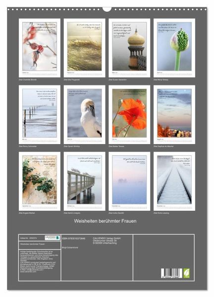 QUALITÄT - Hochwertiger Fotokalender mit 12 wunderschönen Motiven auf lichtbeständigem Bilderdruckpapier, robuste Spiralbindung mit Aufhängebügel.NACHHALTIG - deutliche Abfallreduzierung durch bedarfsgerechte Einzelstückfertigung, umweltfreundliches FSC-zertifiziertes Papier, Produktion in Deutschland, klimabewusste Logistik.PERFEKTES GESCHENK - Kalender für Freunde und Familie, für Kinder und Erwachsene, jung und alt, zu Weihnachten, Geburtstag oder zwischendurch.VIELFALT - Bildkalender in verschiedenen Formaten, z.B. DIN A5, DIN A4, DIN A3 sowie DIN A2. Ob Naturmotiv, Gemälde oder Fotos, ideal für ein persönliches Wohlfühlambiente.Eindrucksvolle Zitate von beeindruckenden Frauen von Autor(in): Birgit Scharnhorst