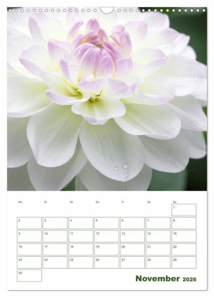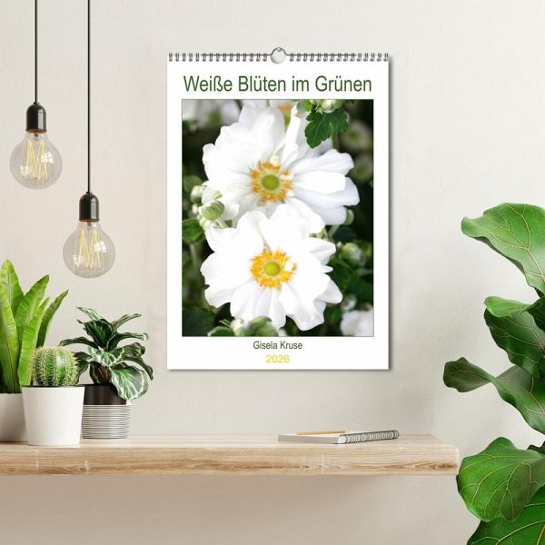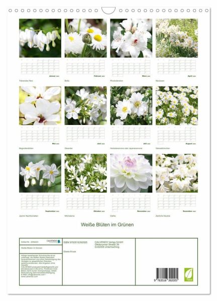 Jedes Kalenderblatt überzeugt mit seinen gelungenen Blütenporträts, sei es die Pracht der Tulpen, des Rhododendrons, der Herbstanemonen oder der Dahlie. Weiß und Grün als die ideale Farbkombination in der Natur, für Sie festgehalten von der Fotografin Gisela Kruse.