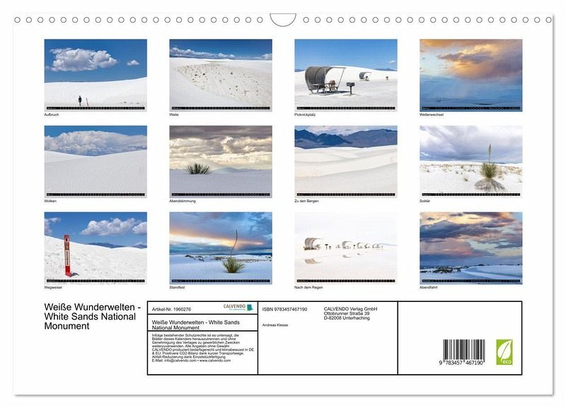 QUALITÄT - Hochwertiger Fotokalender mit 12 wunderschönen Motiven auf lichtbeständigem Bilderdruckpapier, robuste Spiralbindung mit Aufhängebügel.NACHHALTIG - deutliche Abfallreduzierung durch bedarfsgerechte Einzelstückfertigung, umweltfreundliches FSC-zertifiziertes Papier, Produktion in Deutschland, klimabewusste Logistik.PERFEKTES GESCHENK - Kalender für Freunde und Familie, für Kinder und Erwachsene, jung und alt, zu Weihnachten, Geburtstag oder zwischendurch.VIELFALT - Bildkalender in verschiedenen Formaten, z.B. DIN A5, DIN A4, DIN A3 sowie DIN A2. Ob Naturmotiv, Gemälde oder Fotos, ideal für ein persönliches Wohlfühlambiente.Schönheit und Vielfalt der einzigartigen Wüstenlandschaft des White Sands National Monuments in Neumexiko von Autor(in): Andreas Klesse