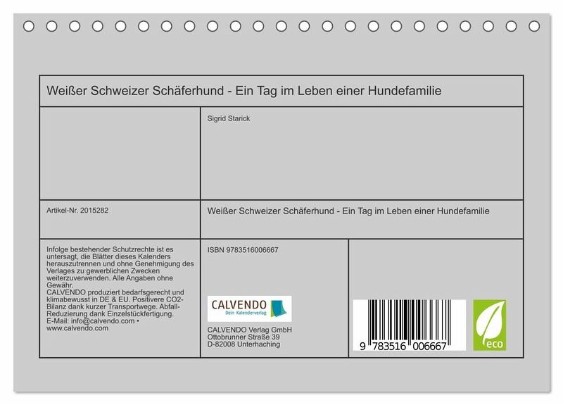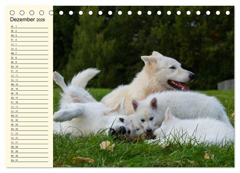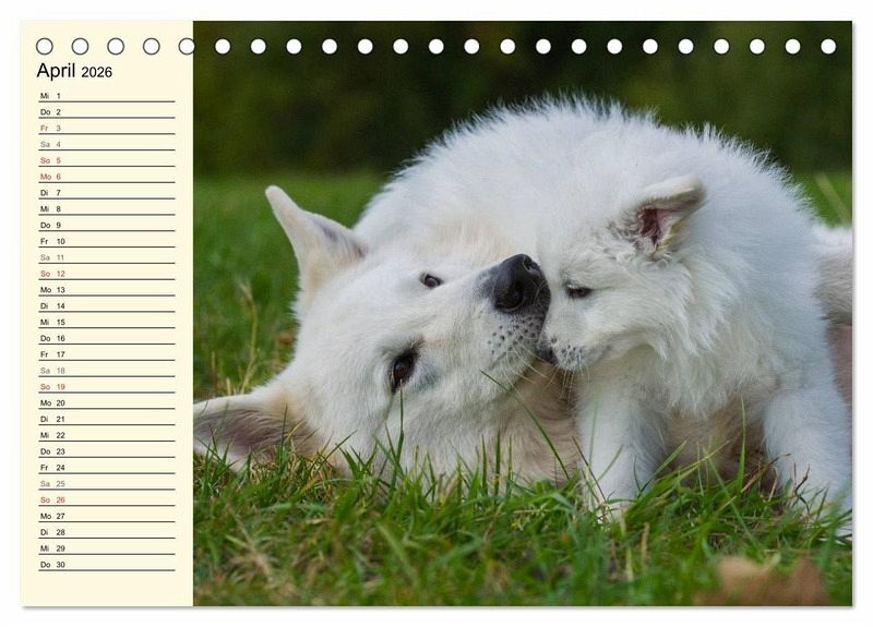 Auf 13 Kalenderblättern zeigt die Tierfotografin Sigrid Starick wunderschöne Weiße Schweizer Schäferhunde. Einen Tag lang hat sie eine ganze Hundefamilie mit ihrer Kamera beobachtet. Lassen Sie sich über das Jahr faszinieren von hinreißenden Welpen und ihren Eltern.