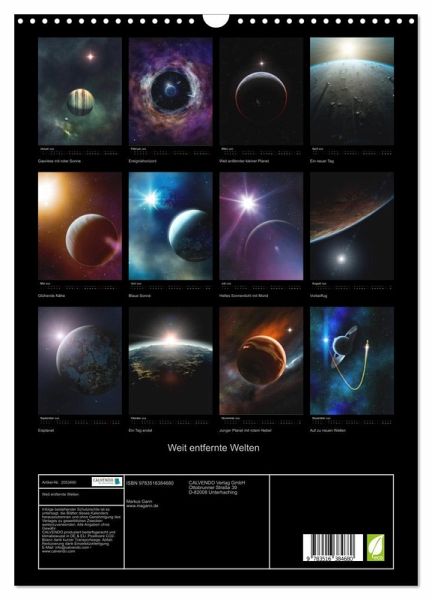 QUALITÄT - Hochwertiger Fotokalender mit 12 wunderschönen Motiven auf lichtbeständigem Bilderdruckpapier, robuste Spiralbindung mit Aufhängebügel.NACHHALTIG - deutliche Abfallreduzierung durch bedarfsgerechte Einzelstückfertigung, umweltfreundliches FSC-zertifiziertes Papier, Produktion in Deutschland, klimabewusste Logistik.PERFEKTES GESCHENK - Kalender für Freunde und Familie, für Kinder und Erwachsene, jung und alt, zu Weihnachten, Geburtstag oder zwischendurch.VIELFALT - Bildkalender in verschiedenen Formaten, z.B. DIN A5, DIN A4, DIN A3 sowie DIN A2. Ob Naturmotiv, Gemälde oder Fotos, ideal für ein persönliches Wohlfühlambiente.Planeten, Fantasybilder aus dem Weltraum. von Autor(in): magann
