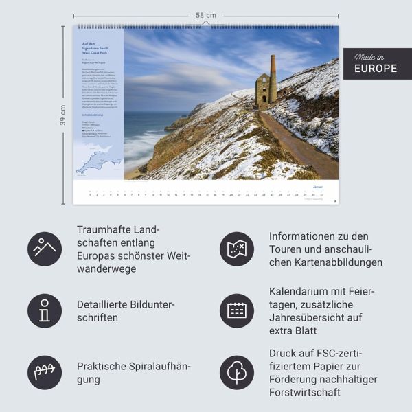 - Für alle, die die Wanderlust gepackt hat: Kalender 2026 mit Landschaften, die den Appetit auf mehr Zeit in der Natur wecken- Kungsleden, Cinque Terre oder Rheinsteig: Mit dem Jahres-Wandkalender 2026 sind sie Monat für Monat auf den schönsten Fernwanderwegen Europas unterwegs- Der Weg ist das Ziel: Fotokalender für alle, die das Abenteuer Weitwandern lieben, mit kleiner Karte und kurzer Strecken-Beschreibung- Das Bergerlebnis für zu Hause: Großer Wandkalender mit beeindruckenden Naturfotografien im Format 58 x 39 cm und Monatskalendarium - Für Naturliebhaber:innen genau das Richtige: Die Landschaftskalender von Heye im Athesia Kalenderverlag