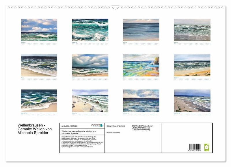 Michaela Spreider (_ 1972 in München) arbeitet als selbstständige Kunsttherapeutin und Künstlerin in ihrem eigenen Atelier. Neben ihrer therapeutischen Arbeit gibt sie Kunstkurse in Malerei und Plastik. Das Malen von brausenden Wellen, pfeifenden Wind und Meeresstimmungen ist ein immer wiederkehrendes Motiv innerhalb ihrer Kunstgruppen. Der Kalender präsentiert zwölf dieser Arbeiten.