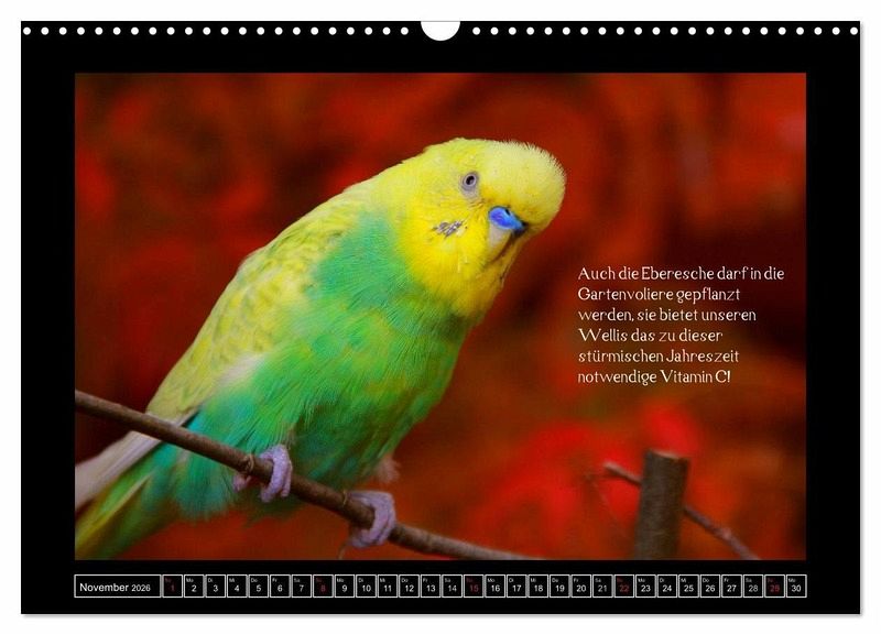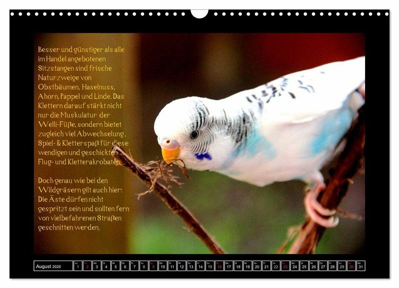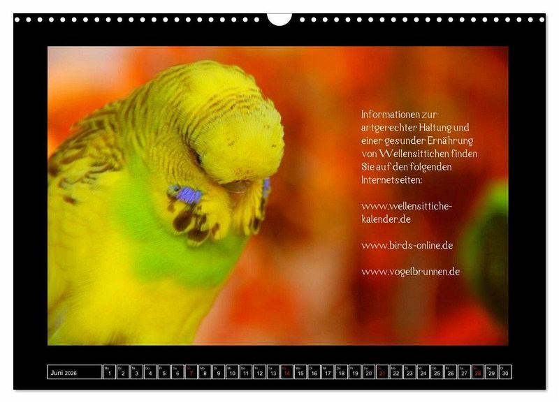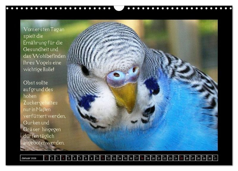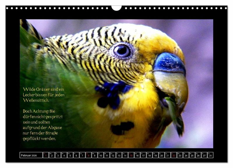 Dieser farbenprächtige Wellensittichkalender besticht durch seine intensiven Portraits glücklicher Wellensittiche. Zahlreiche informative Tipps zur gesunden Ernährung Ihrer Wellensittiche runden diesen wunderschönen, hochwertigen Kalender ab. Es ist der Nachfolger der Nr. 1 CALVENDO-BESTSELLER "Wilde Wellensittiche", "Wellensittiche - Naturkalender" und der "Wellensittichkalender - Schmuck Edition", die alle drei aufgrund der enormen Nachfrage für das Jahr 2016 mit neuen Kalendarien wiederveröffentlicht werden.
