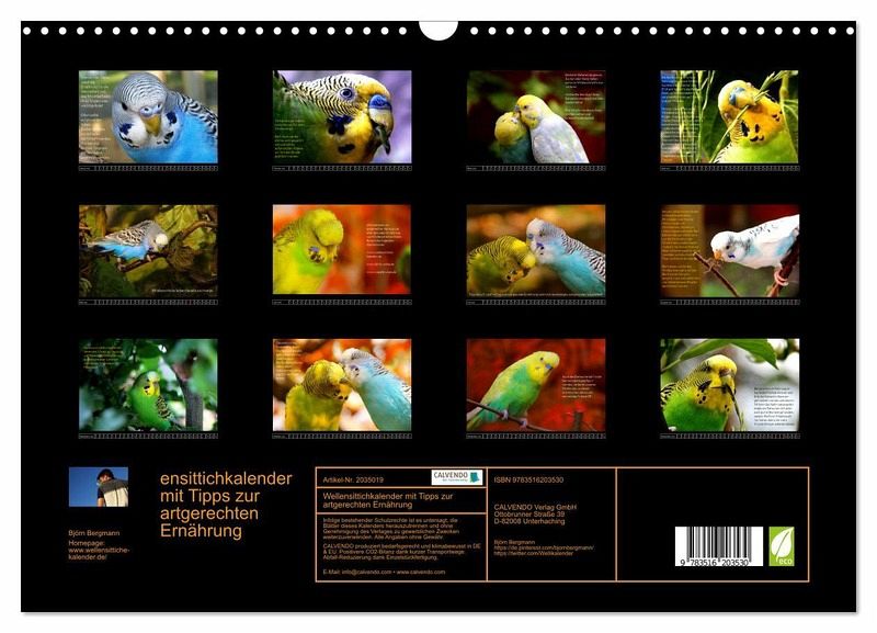 QUALITÄT - Hochwertiger Fotokalender mit 12 wunderschönen Motiven auf lichtbeständigem Bilderdruckpapier, robuste Spiralbindung mit Aufhängebügel.NACHHALTIG - deutliche Abfallreduzierung durch bedarfsgerechte Einzelstückfertigung, umweltfreundliches FSC-zertifiziertes Papier, Produktion in Deutschland, klimabewusste Logistik.PERFEKTES GESCHENK - Kalender für Freunde und Familie, für Kinder und Erwachsene, jung und alt, zu Weihnachten, Geburtstag oder zwischendurch.VIELFALT - Bildkalender in verschiedenen Formaten, z.B. DIN A5, DIN A4, DIN A3 sowie DIN A2. Ob Naturmotiv, Gemälde oder Fotos, ideal für ein persönliches Wohlfühlambiente.Dieser außergewöhnliche Wellensittichkalender wurde prall aufgefüllt mit herrlichen Fotografien und informativen Tipps zur artgerechten Ernährung. Hier vereinen sich Ratgeber & Kalender zu einem hochwertigen Wandschmuck! von Autor(in): Björn Bergmann