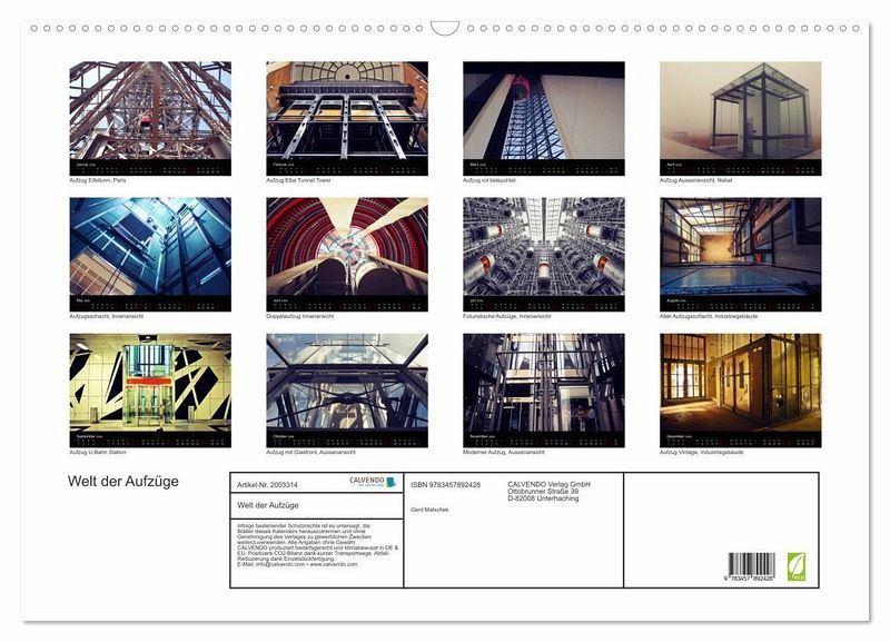 QUALITÄT - Hochwertiger Fotokalender mit 12 wunderschönen Motiven auf lichtbeständigem Bilderdruckpapier, robuste Spiralbindung mit Aufhängebügel.NACHHALTIG - deutliche Abfallreduzierung durch bedarfsgerechte Einzelstückfertigung, umweltfreundliches FSC-zertifiziertes Papier, Produktion in Deutschland, klimabewusste Logistik.PERFEKTES GESCHENK - Kalender für Freunde und Familie, für Kinder und Erwachsene, jung und alt, zu Weihnachten, Geburtstag oder zwischendurch.VIELFALT - Bildkalender in verschiedenen Formaten, z.B. DIN A5, DIN A4, DIN A3 sowie DIN A2. Ob Naturmotiv, Gemälde oder Fotos, ideal für ein persönliches Wohlfühlambiente.Aufzüge als modernes Wunder der Technik. von Autor(in): Gerd Matschek