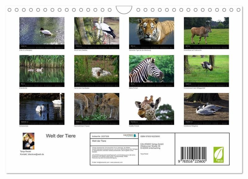 QUALITÄT - Hochwertiger Fotokalender mit 12 wunderschönen Motiven auf lichtbeständigem Bilderdruckpapier, robuste Spiralbindung mit Aufhängebügel.NACHHALTIG - deutliche Abfallreduzierung durch bedarfsgerechte Einzelstückfertigung, umweltfreundliches FSC-zertifiziertes Papier, Produktion in Deutschland, klimabewusste Logistik.PERFEKTES GESCHENK - Kalender für Freunde und Familie, für Kinder und Erwachsene, jung und alt, zu Weihnachten, Geburtstag oder zwischendurch.VIELFALT - Bildkalender in verschiedenen Formaten, z.B. DIN A5, DIN A4, DIN A3 sowie DIN A2. Ob Naturmotiv, Gemälde oder Fotos, ideal für ein persönliches Wohlfühlambiente.Tiere verzaubern uns, dieser Kalender bietet einen kleinen Einblick in die Vielfalt unserer Tierwelt von Autor(in): Tanja Riedel