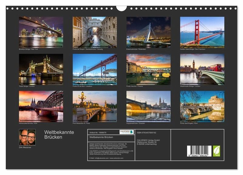 Der Fotograf D.Meutzner zeigt Ihnen einige der schönsten Brücken, aus verschiedenen Ländern und Kontinenten. Es sind fantastische Bauwerke, historisch oder modern. Zusammengefasst in diesem einmalig schönen Kalender, der Sie das ganze Jahr faszinieren wird.