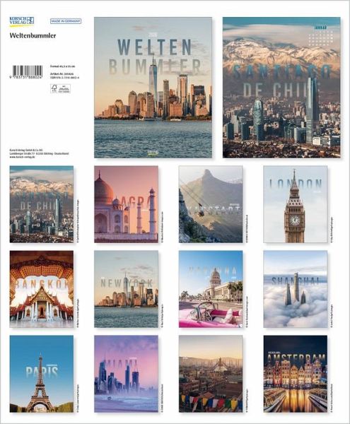 Mit dem Kalender Weltenbummler geht es auf Entdeckungsreise zu den schönsten Städten der Welt im angesagten Poster-Look. Jedes Monatsblatt präsentiert eine andere Stadt, kunstvoll kombiniert mit modern gestalteter Typografie, sodass ein harmonisches Gesamtkunstwerk entsteht. Der perfekte Wandschmuck für alle Reisebegeisterten.