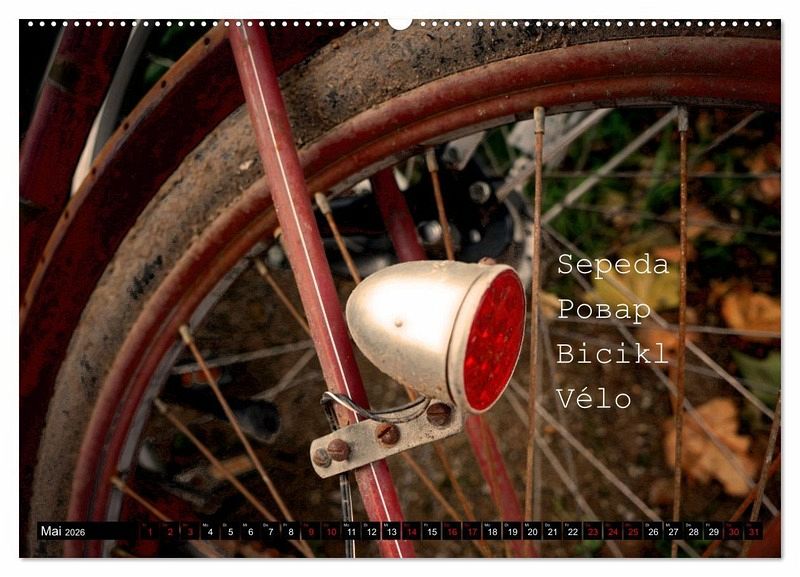 Die Detail Aufnahmen nostalgischer Fahrräder zeigen wie kunstvoll und leidenschaftlich Bauteile früher ausgeführt wurden. Sie zeigen Scham und Ästhetik bei gleichzeitig guter Funktion und Handhabung. Fahrräder werden nahezu in der ganzen Welt benutzt im Kalender kann man das Wort Fahrrad in 48 Sprachen finden.