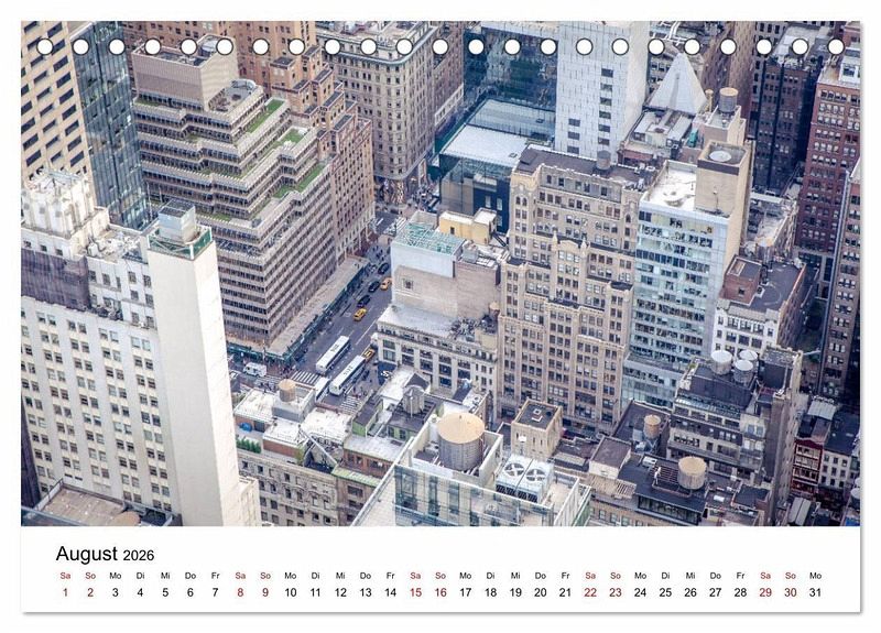 Ein einzigartiger und wunderbarer Photoreport über New York City vom Boden, Wasser und aus der Luft. Der Kalender zeigt Orte, die jeder Tourist selbst bereisen kann und nimmt ihn mit zu sehenswerten und auch unbekannten Ecken dieser Großstadt. Dieser Städtekalender zeigt sowohl die Ruhe im hippen Chelsea, über die Hektik des Times Squares bis zum Helikopterflug über den Hudson River mit der allgegenwärtigen Dominanz des One World Trade Centers. Für jeden, der New York entdecken, oder seine eigenen Erlebnisse noch einmal in Erinnerung rufen möchte, ist dieser Wandkalender genau das Richtige.