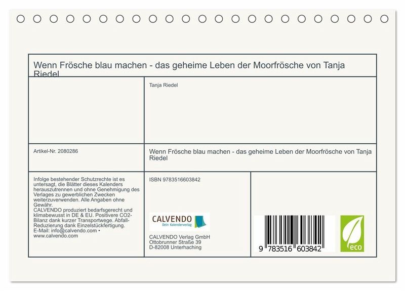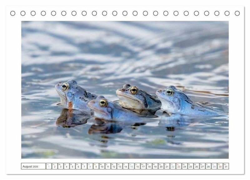 Einmal im Jahr machen sie blau - und das mit voller Leidenschaft: Moorfrosch-Maennchen zeigen zur Paarungszeit ihr seltenes Farbspiel in leuchtendem Himmelblau. Dieser Kalender faengt dieses faszinierende Naturspektakel auf einzigartige Weise ein - mit Witz, Stil und einem Hauch Froschromantik. Ob solo im Schilf, in trauter Zweisamkeit oder als Quak-Konzert im Moor: Diese Aufnahmen sind nicht nur selten, sondern einfach besonders. Fotografiert von Tanja Riedel - mit Humor, Hingabe und einem Blick fuer das Ungewoehnliche. Ein Naturkalender fuer alle, die Tiere lieben, gern schmunzeln und wissen, dass Blau mehr sein kann als nur eine Farbe.