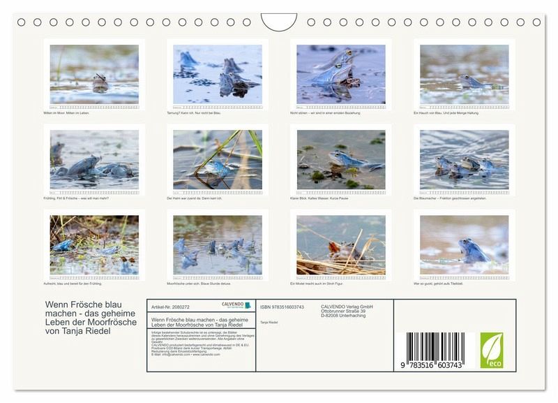 Einmal im Jahr machen sie blau - und das mit voller Leidenschaft: Moorfrosch-Maennchen zeigen zur Paarungszeit ihr seltenes Farbspiel in leuchtendem Himmelblau. Dieser Kalender faengt dieses faszinierende Naturspektakel auf einzigartige Weise ein - mit Witz, Stil und einem Hauch Froschromantik. Ob solo im Schilf, in trauter Zweisamkeit oder als Quak-Konzert im Moor: Diese Aufnahmen sind nicht nur selten, sondern einfach besonders. Fotografiert von Tanja Riedel - mit Humor, Hingabe und einem Blick fuer das Ungewoehnliche. Ein Naturkalender fuer alle, die Tiere lieben, gern schmunzeln und wissen, dass Blau mehr sein kann als nur eine Farbe.