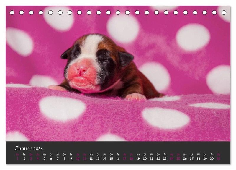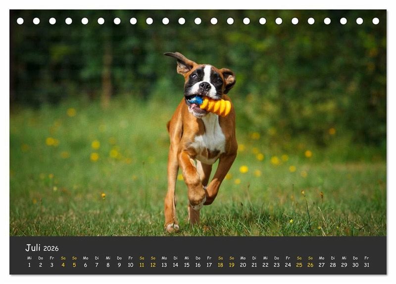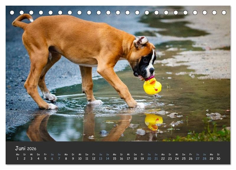 Eine Bilderserie die das Herz von Boxerliebhabern mit Sicherheit höher schlagen läßt. Eben noch liegt der winzige Welpe mit geschlossenen Augen auf einer Decke. Dann sitzt er schon ganz stolz auf einer Bank, um bald darauf schon fast wie ein ausgewachsener Hund zu posieren. "Wenn ich groß bin werd' ich Boxer" unter diesem Motto zeigt der Kalender die schönsten 13 Fotos aus dem ersten Lebensjahr eines Deutschen Boxers.