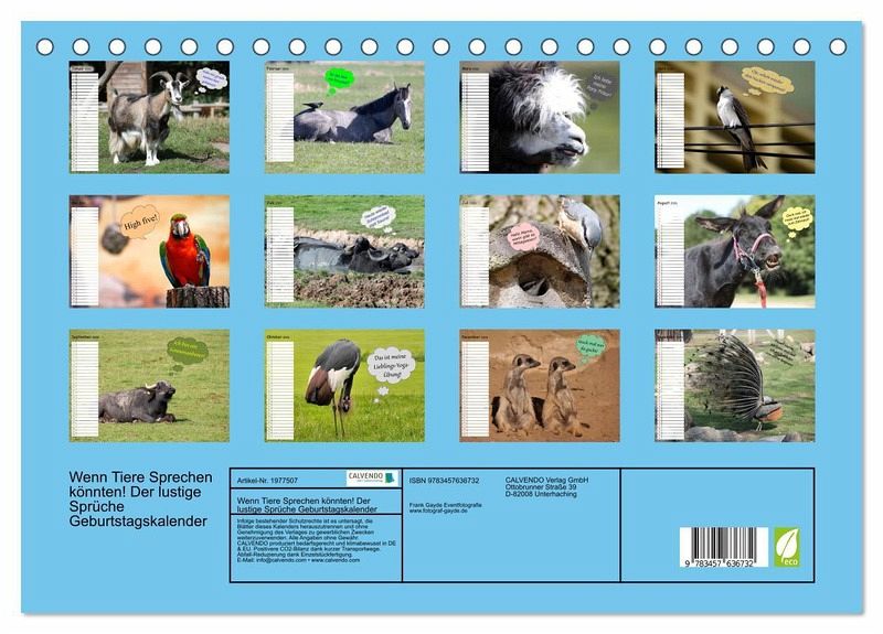 QUALITÄT - Hochwertiger Fotokalender mit 12 wunderschönen Motiven auf lichtbeständigem Bilderdruckpapier, robuste Spiralbindung.NACHHALTIG - deutliche Abfallreduzierung durch bedarfsgerechte Einzelstückfertigung, umweltfreundliches FSC-zertifiziertes Papier, Produktion in Deutschland, klimabewusste Logistik.PERFEKTES GESCHENK - Kalender für Freunde und Familie, für Kinder und Erwachsene, jung und alt, zu Weihnachten, Geburtstag oder zwischendurch.VIELFALT - Bildkalender in verschiedenen Formaten, z.B. DIN A5, DIN A4, DIN A3 sowie DIN A2. Ob Naturmotiv, Gemälde oder Fotos, ideal für ein persönliches Wohlfühlambiente.Lustige Mimik und Bilder verschiedener Tierarten erheitern ihnen den Weg durchs Kalenderjahr. Geburtstagskalender. von Autor(in): Frank Gayde