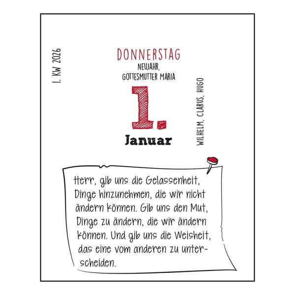 Glauben muss keine bitterernste Angelegenheit sein. Dieser Kalender hält für jeden Tag des Jahres neue Anekdoten, Witze und Aphorismen über bzw. von christlichen Persönlichkeiten wie Papst Franziskus, Johannes XXIII., Karl Barth, Winston Churchill, Mark Twain, Martin Luther, Marie von Ebner-Eschenbach u. v. a. passend zu Gedenktagen oder Jubiläen bereit. Die praktische Ringbindung macht ihn besonders handlich.- humorvolle Weisheiten, Witze und Anekdoten für jeden Tag- handliches Format und praktische Ringbindung