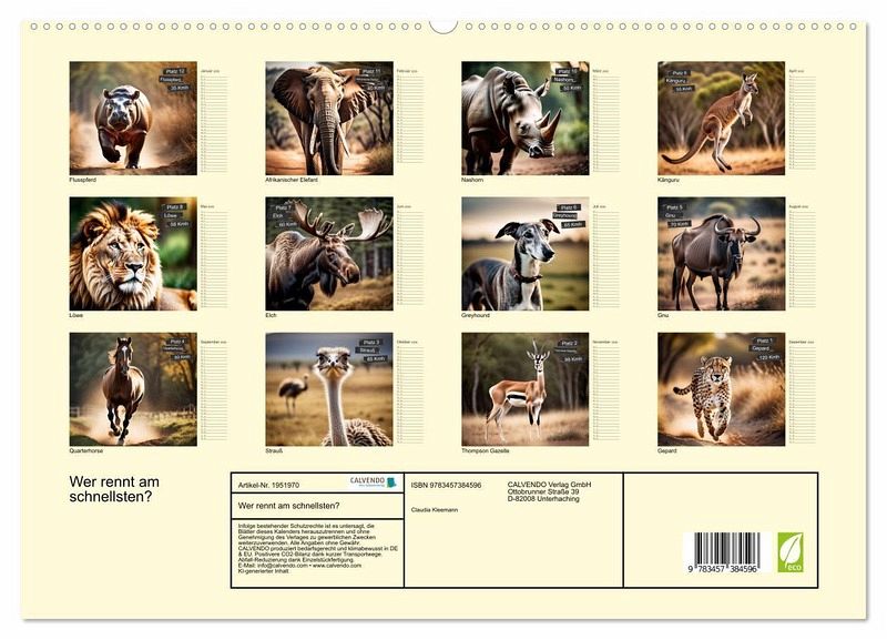 PREMIUM-LINIE - Brillanter Fotokalender mit 12 wunderschönen Motiven, Kunstdruck in Hochglanz in Museumsqualität.QUALITÄT - edle Materialien, stabile Rückwand mit 2 innovativen Einstecktaschen für eine optimale Präsentation an der Wand.NACHHALTIG - deutliche Abfallreduzierung durch bedarfsgerechte Einzelstückfertigung, umweltfreundliches FSC-zertifiziertes Papier, Produktion in Deutschland, klimabewusste Logistik.PERFEKTES GESCHENK - Kalender für Freunde und Familie, für Kinder und Erwachsene, jung und alt, zu Weihnachten, Geburtstag oder zwischendurch.Die 12 schnellsten Landtiere im Vergleich von Autor(in): Claudia Kleemann