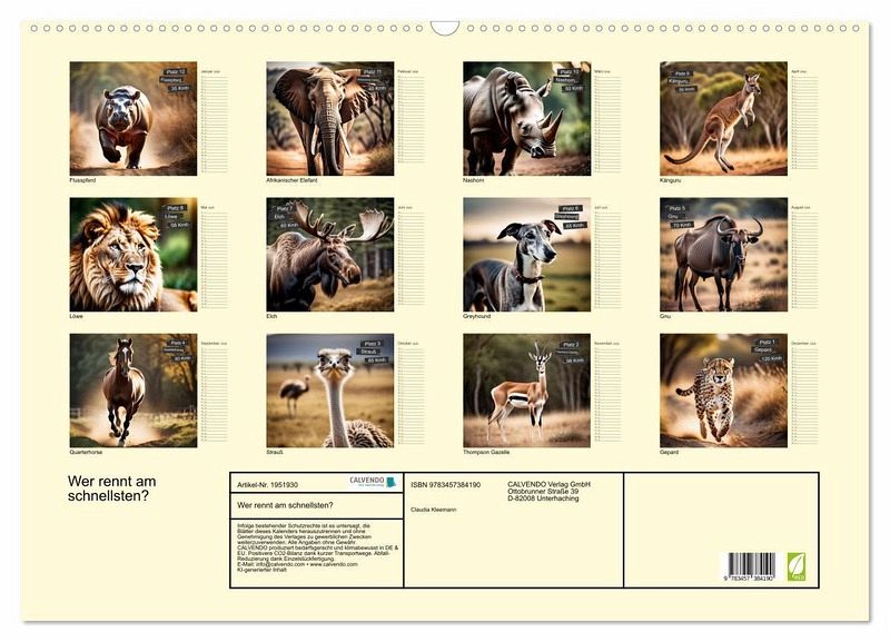QUALITÄT - Hochwertiger Fotokalender mit 12 wunderschönen Motiven auf lichtbeständigem Bilderdruckpapier, robuste Spiralbindung mit Aufhängebügel.NACHHALTIG - deutliche Abfallreduzierung durch bedarfsgerechte Einzelstückfertigung, umweltfreundliches FSC-zertifiziertes Papier, Produktion in Deutschland, klimabewusste Logistik.PERFEKTES GESCHENK - Kalender für Freunde und Familie, für Kinder und Erwachsene, jung und alt, zu Weihnachten, Geburtstag oder zwischendurch.VIELFALT - Bildkalender in verschiedenen Formaten, z.B. DIN A5, DIN A4, DIN A3 sowie DIN A2. Ob Naturmotiv, Gemälde oder Fotos, ideal für ein persönliches Wohlfühlambiente.Die 12 schnellsten Landtiere im Vergleich von Autor(in): Claudia Kleemann