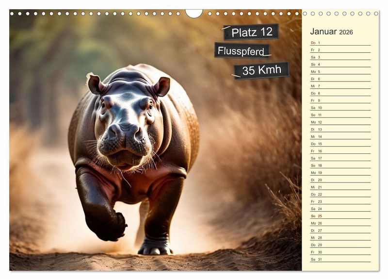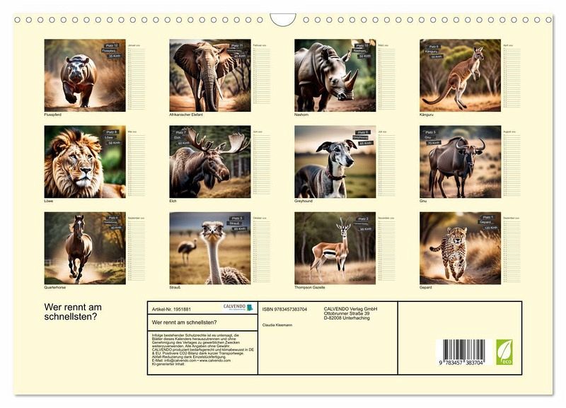 QUALITÄT - Hochwertiger Fotokalender mit 12 wunderschönen Motiven auf lichtbeständigem Bilderdruckpapier, robuste Spiralbindung mit Aufhängebügel.NACHHALTIG - deutliche Abfallreduzierung durch bedarfsgerechte Einzelstückfertigung, umweltfreundliches FSC-zertifiziertes Papier, Produktion in Deutschland, klimabewusste Logistik.PERFEKTES GESCHENK - Kalender für Freunde und Familie, für Kinder und Erwachsene, jung und alt, zu Weihnachten, Geburtstag oder zwischendurch.VIELFALT - Bildkalender in verschiedenen Formaten, z.B. DIN A5, DIN A4, DIN A3 sowie DIN A2. Ob Naturmotiv, Gemälde oder Fotos, ideal für ein persönliches Wohlfühlambiente.Die 12 schnellsten Landtiere im Vergleich von Autor(in): Claudia Kleemann