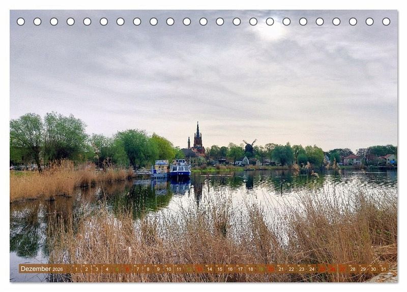 Juli: Blick über die Föhse mit dem Boot Havelwunder, Kirche und Bockwindmühle