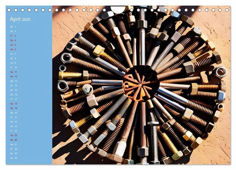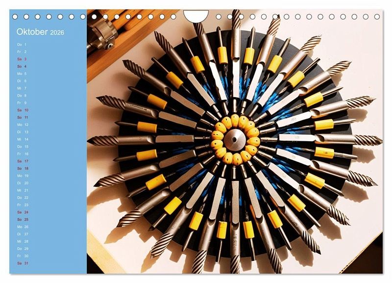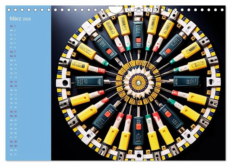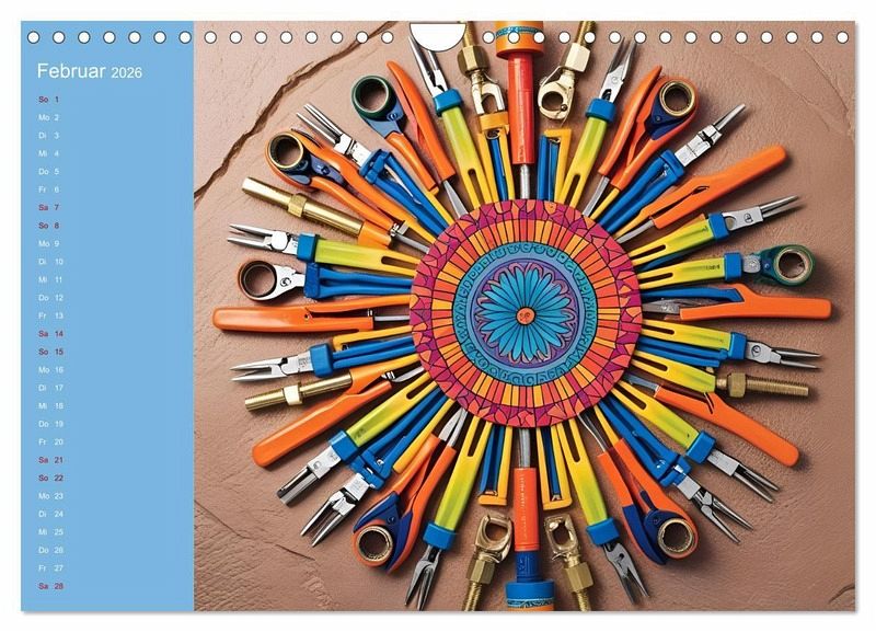 Tauchen Sie ein in die faszinierende Welt der Mandalas, die auf einzigartige Weise mit Werkzeugteilen gestaltet wurden. Dieser Kalender präsentiert jeden Monat ein neues durch KI generiertes Mandala, das die kreative Verbindung zwischen Handwerk und Kunst zeigt.