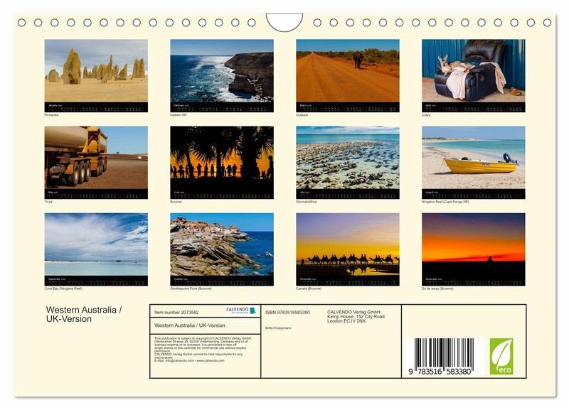 QUALITY - High-quality photo calendar with 12 beautiful images on light-resistant paper, robust spiral binding with hanger.SUSTAINABLE - Significant waste reduction due to print-on-demand production, environmentally friendly FSC-certified paper, produced in the UK, climate-conscious logistical processes.PERFECT GIFT - calendars for friends and family, for children, all ages and all occasions, from Christmas to birthdays and everything in between.LOTS OF CHOICE - Wall calendars in different sizes (DIN A4 and DIN A3), for any topic and personal taste, featuring photography, painting and illustrations.Western Australia - Endless wideness, wild nature and only few people, author: Britta Knappmann