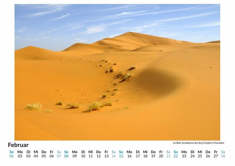 Entdecken Sie die faszinierende Schönheit der Westsahara mit unserem exklusiven Wandkalender! Lassen Sie sich Monat für Monat von atemberaubenden Landschaften, endlosen Dünen und der einzigartigen Kultur dieser geheimnisvollen Region verzaubern. Jedes der 12 sorgfältig ausgewählten Motive wurde auf hochwertigem, lichtbeständigem Bilderdruckpapier gedruckt, um Ihnen das ganze Jahr über brillante Farben zu garantieren. Gedruckt in Deutschland auf FSC-zertifiziertem Papier, vereint dieser Kalender Nachhaltigkeit und Ästhetik. Perfekt für Ihr Zuhause oder als Geschenk - holen Sie sich ein Stück Westsahara in Ihre vier Wände! Jetzt bestellen und inspirieren lassen! Hochwertig Erleben Sie ein Jahr voller Eleganz mit unserem Premium-Fotokalender. Jedes der 12 Motive ist auf hochwertigem, lichtbeständigem Bilderdruckpapier gedruckt, um die Lebendigkeit jedes Bildes zu bewahren. Die robuste Spiralbindung gewährleistet Langlebigkeit und einfache Handhabung. Nachhaltig Unser Engagement für die Umwelt spiegelt sich in jedem Exemplar wider. Durch die Produktion auf Abruf reduzieren wir signifikant unseren Abfall. Wir verwenden ausschließlich umweltfreundliches, FSC-zertifiziertes Papier. Stolz gefertigt in Deutschland, achten wir bei unserer Logistik auf Klimaschutz, um unseren ökologischen Fußabdruck zu minimieren. Das ideale Geschenk Dieser Kalender ist das perfekte Präsent für jeden Anlass - ob Weihnachten, Geburtstage oder einfach als liebevolle Aufmerksamkeit zwischendurch. Geeignet für Freunde, Familie, Kinder und Erwachsene gleichermaßen, bereichert er jedes Zuhause mit seiner Vielfalt und Schönheit, unabhängig vom Alter der Beschenkten.
