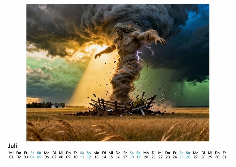 Was, wenn die Kräfte, die unseren Himmel formen, ein eigenes Bewusstsein besäßen? Der Kalender "Wetterphänomene als Götter" erkundet diese Vorstellung und zeigt die Urgewalt des Wetters in einer neuen Gestalt. Mächtige Wesen aus Wolken, Blitzen und Licht beherrschen die zwölf Monatsblätter und erzählen Geschichten von Macht, Ruhe und Wandel. Dieser Kalender ist eine passende Wahl: * Für Liebhaber von Mythologie und alten Göttersagen. * Für Menschen, die von der Kraft und Ästhetik von Wetterereignissen fasziniert sind. * Für alle, die eine unkonventionelle und fantasievolle Wanddekoration suchen. Jeder Monat enthüllt eine andere Gottheit. Ein wirbelnder Tornado manifestiert sich als tanzender Riese, die sanften Polarlichter werden zum leuchtenden Schleier einer Himmelskönigin und zuckende Blitze formen die Speere eines zornigen Kriegers. Durch das Zusammenspiel von kreativen Impulsen und komplexen Algorithmen entstanden diese Motive, die die Grenze zwischen Fotografie und Fantasie verschwimmen lassen. Was der Kalender bietet: * Zwölf Monatsmotive, die Wetterphänomene als personifizierte Wesen darstellen. * Ein praktisches Kalendarium für die Jahresplanung. * Eine visuelle Reise durch ein Jahr voller mythischer Naturgewalten. Dieser Kalender ist eine Hommage an die ungezähmte Energie der Natur. Er interpretiert Stürme und Stille neu und verwandelt das Alltägliche in etwas Mythisches. Eine Entdeckung der Götter, die direkt über uns wachen.