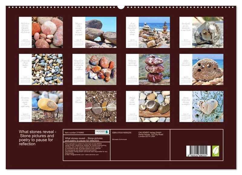 PREMIUM COLLECTION - Brilliant photo calendar with 12 beautiful motifs, high-gloss art print in museum quality.QUALITY - high-quality materials, sturdy back cover with 2 innovative insert pockets for optimum presentation on the wall.SUSTAINABLE - significant reduction in waste thanks to customised one-off production, environmentally friendly FSC-certified paper, production in Germany, climate-conscious logistics.PERFECT GIFT - calendars for friends and family, for children and adults, young and old, for Christmas, birthdays or in between.Poetry and stone. A mindful calendar. von Autor(in): Michaela Spreider