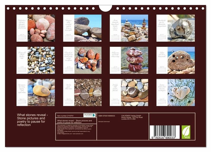 QUALITY - High-quality photo calendar with 12 beautiful images on light-resistant paper, robust spiral binding with hanger.SUSTAINABLE - Significant waste reduction due to print-on-demand production, environmentally friendly FSC-certified paper, produced in the UK, climate-conscious logistical processes.PERFECT GIFT - calendars for friends and family, for children, all ages and all occasions, from Christmas to birthdays and everything in between.LOTS OF CHOICE - Wall calendars in different sizes (DIN A4 and DIN A3), for any topic and personal taste, featuring photography, painting and illustrations.Poetry and stone. A mindful calendar., author: Michaela Spreider