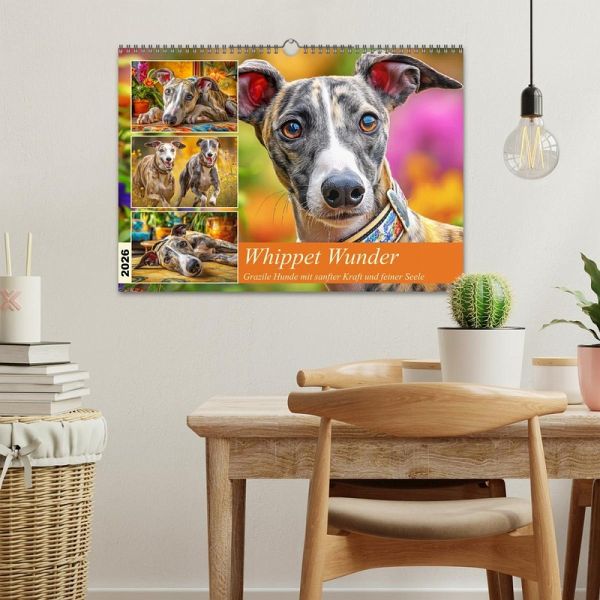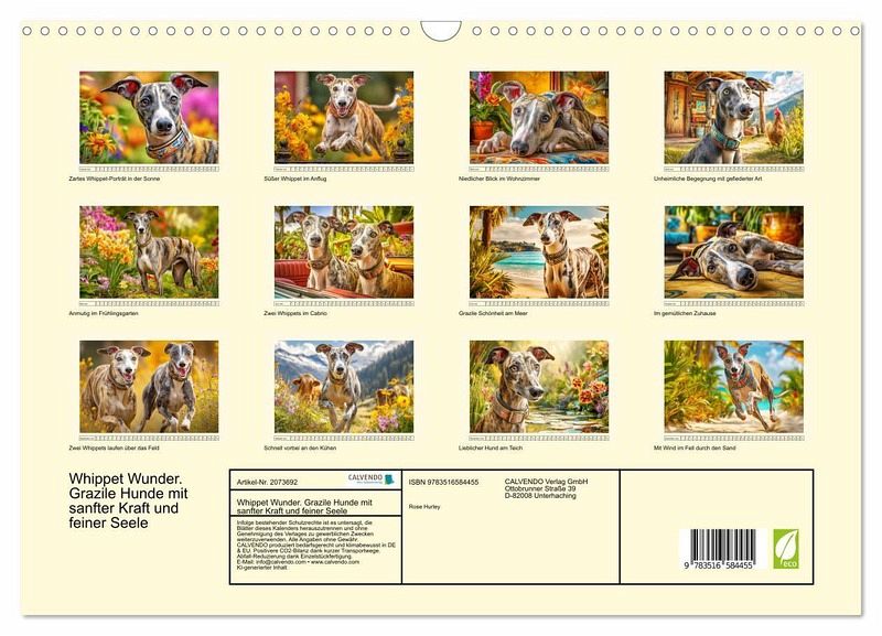 Dieser Kalender zeigt Whippets so, wie man sie liebt - feinfühlig, anmutig und voller Energie. Ihre schlanke Silhouette, der wache Blick und ihr sanftes Wesen machen sie zu ganz besonderen Begleitern. Jedes Bild wurde mit der Hilfe von KI erstellt und erzählt von ihrer stillen Stärke und lebendigen Eleganz. Es ist eine liebevolle Hommage an einen Hund, der Kraft und Leichtigkeit in sich vereint.