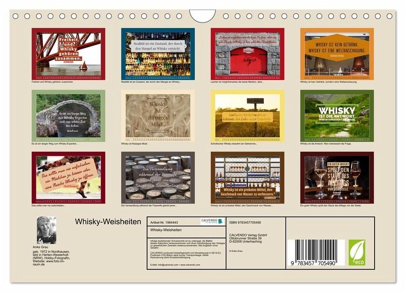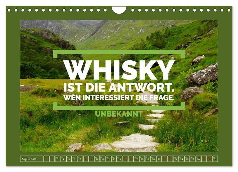 QUALITÄT - Hochwertiger Fotokalender mit 12 wunderschönen Motiven auf lichtbeständigem Bilderdruckpapier, robuste Spiralbindung mit Aufhängebügel.NACHHALTIG - deutliche Abfallreduzierung durch bedarfsgerechte Einzelstückfertigung, umweltfreundliches FSC-zertifiziertes Papier, Produktion in Deutschland, klimabewusste Logistik.PERFEKTES GESCHENK - Kalender für Freunde und Familie, für Kinder und Erwachsene, jung und alt, zu Weihnachten, Geburtstag oder zwischendurch.VIELFALT - Bildkalender in verschiedenen Formaten, z.B. DIN A5, DIN A4, DIN A3 sowie DIN A2. Ob Naturmotiv, Gemälde oder Fotos, ideal für ein persönliches Wohlfühlambiente.Mit flotten Sprüchen über Whisky durchs Jahr von Autor(in): Anke Grau