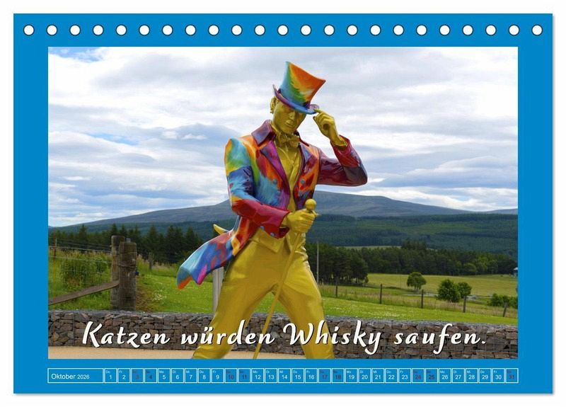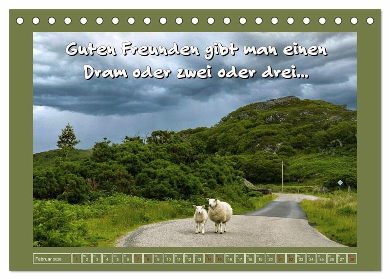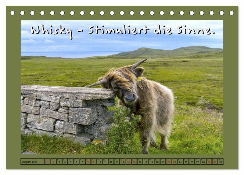 Wer Schottland mag, gerne Whisky trinkt und zudem Humor hat, liegt mit diesem tollen Kalender goldrichtig. Die Autorin hat mit viel Liebe zum Detail alte Werbesprüche umgemünzt und mit ihren vielfältigen professionellen Schottland-Fotos kombiniert. Eine witzige Idee mit 12 verschiedenen Slogans für das ganze Jahr!