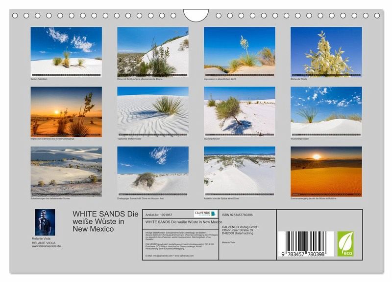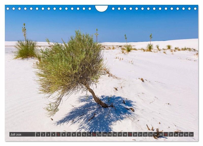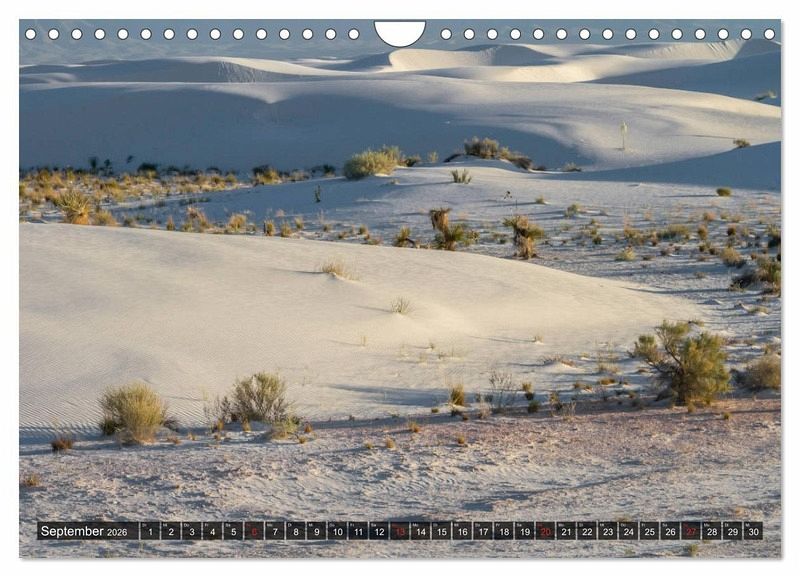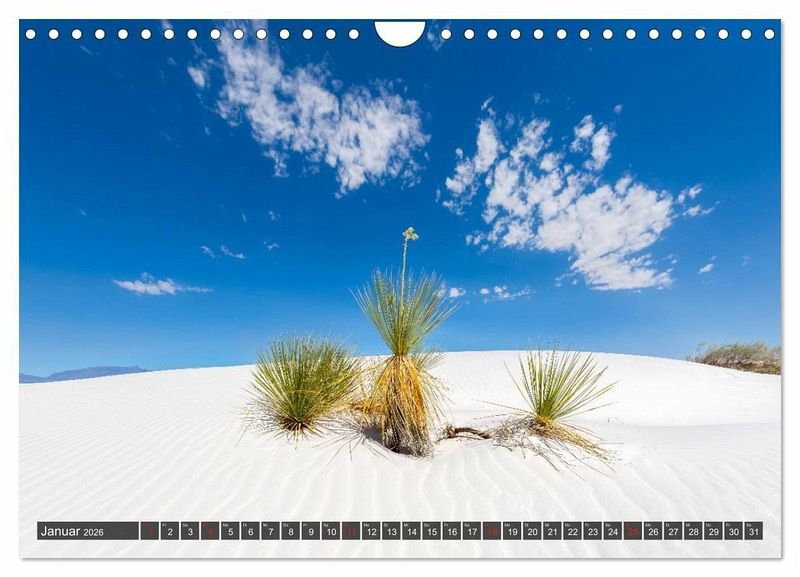 Wie ein Meer aus Sand erhebt sich das White Sands National Monument aus dem Tularosa Becken inmitten der Chihuahua-Wüste New Mexicos. Die wellenförmigen Dünen bestehen aus Gipssand und sind daher bei Tageslicht strahlend weiß. Entdecken Sie mit diesem Kalender das faszinierende Naturschutzgebiet nahe Alamogordo und lassen sich das ganze Jahr von den landschaftlichen Eindrücken begleiten.