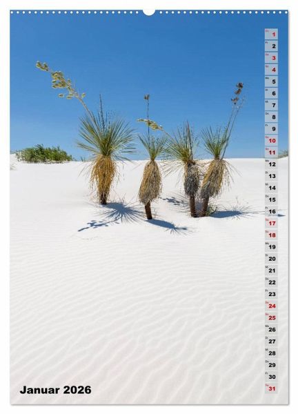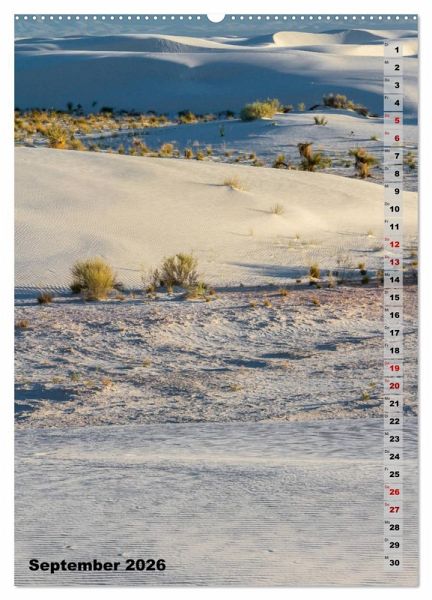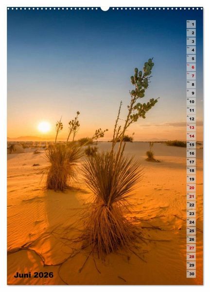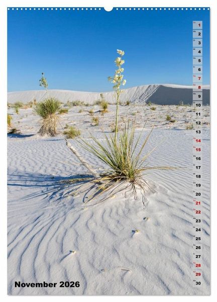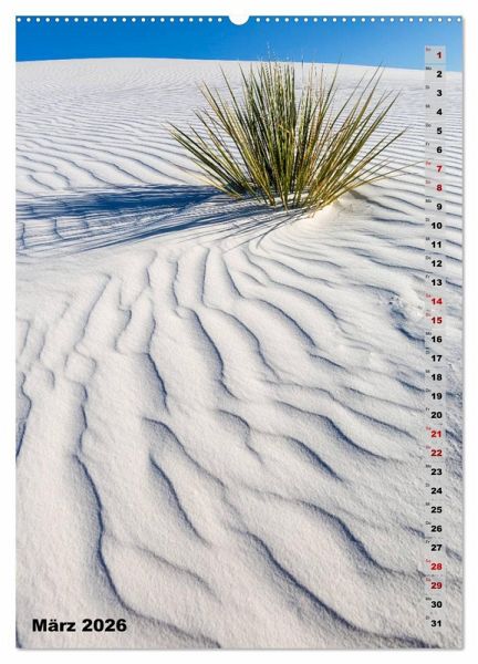 Wie ein Meer aus Sand erhebt sich das White Sands National Monument aus dem Tularosa Becken inmitten der Chihuahua-Wüste New Mexicos. Die wellenförmigen Dünen bestehen aus Gipssand und sind daher bei Tageslicht strahlend weiß. Entdecken Sie mit diesem Kalender das bezaubernde Naturschutzgebiet nahe Alamogordo und lassen sich das ganze Jahr von den landschaftlichen Eindrücken begleiten. Dieser qualitativ hochwertige Kalender gehört zur exklusiven CALVENDO Gold-Edition.