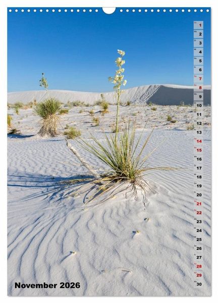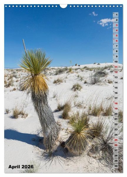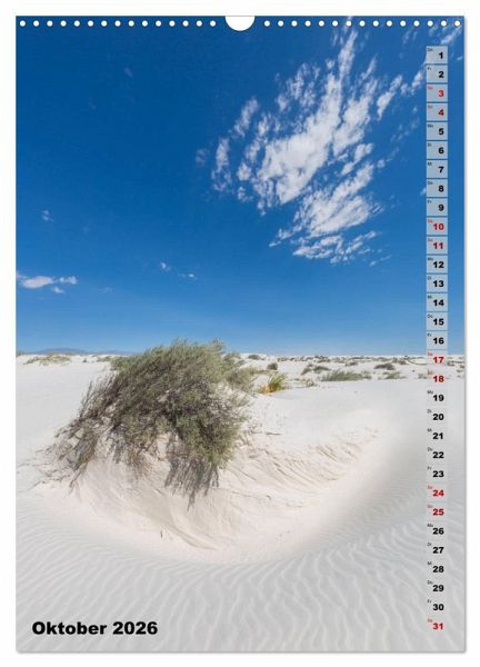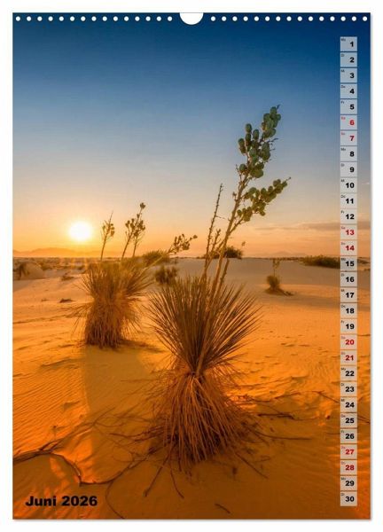 Wie ein Meer aus Sand erhebt sich das White Sands National Monument aus dem Tularosa Becken inmitten der Chihuahua-Wüste New Mexicos. Die wellenförmigen Dünen bestehen aus Gipssand und sind daher bei Tageslicht strahlend weiß. Entdecken Sie mit diesem Kalender das bezaubernde Naturschutzgebiet nahe Alamogordo und lassen sich das ganze Jahr von den landschaftlichen Eindrücken begleiten. Dieser qualitativ hochwertige Kalender gehört zur exklusiven CALVENDO Gold-Edition.