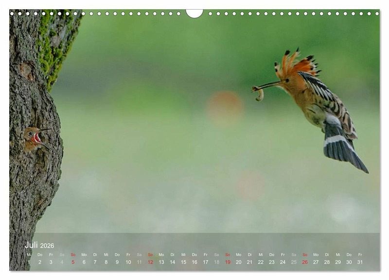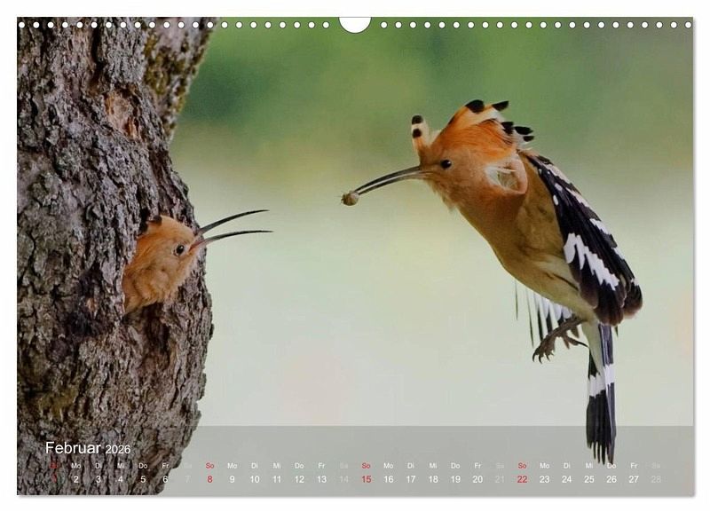 Dieser spannende Kalender zeigt dynamische und ungewöhnliche Aufnahmen aus dem Alltag eines Wiedehopfpaares bei der Aufzucht des Nachwuchses im Frühsommer.