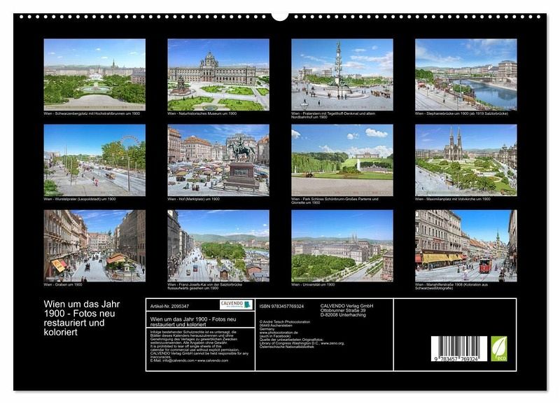 Wien, die Hauptstadt der Republik Österreich, ist heute eine Weltmetropole und war auch in den Jahren 1890 bis 1910 bunt und voller Leben. Diese schönen, farblich restaurierten und nachkolorierten Fotografien sollen einen besonderen Einblick in den Alltag der Menschen und bekannte Orte zur Kaiserzeit geben, auch wenn es in diesem Kalender nur eine kleine Auswahl an Örtlichkeiten ist. Aber nie war diese alte Zeit so lebendig. Eine Zeitreise in Bildern.