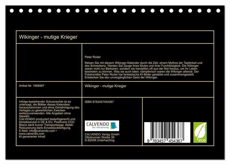 Reisen Sie mit diesem Wikinger-Kalender durch die Zeit, einem Mythos der Tapferkeit und des Schreckens. Werden Sie Zeuge ihres Mutes und ihrer Furchtlosigkeit. Die Wikinger waren nicht nur Barbaren, sondern sie handelten oft aus der Not heraus, um ihr Leben bestreiten zu können. Was sie auch taten, kämpferisch waren die Wikinger allemal. Der Fotokünstler Peter Roder hat fantastische KI-Bilder gestaltet und zusammengestellt. Entdecken Sie den unvergänglichen Geist der Wikinger.