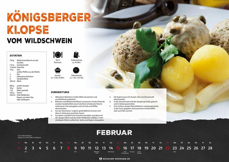 Der Neumann-Neudamm "Wild & Würzig" Kochkalender erscheint im Jahr 2026 mit 12 leckeren Wildschwein-Rezepten und stilvollem Kalendarium inkl. Feiertagsangaben im DIN A3 Format. Ein absolutes Muss für alle Fans der feinen Wildküche!